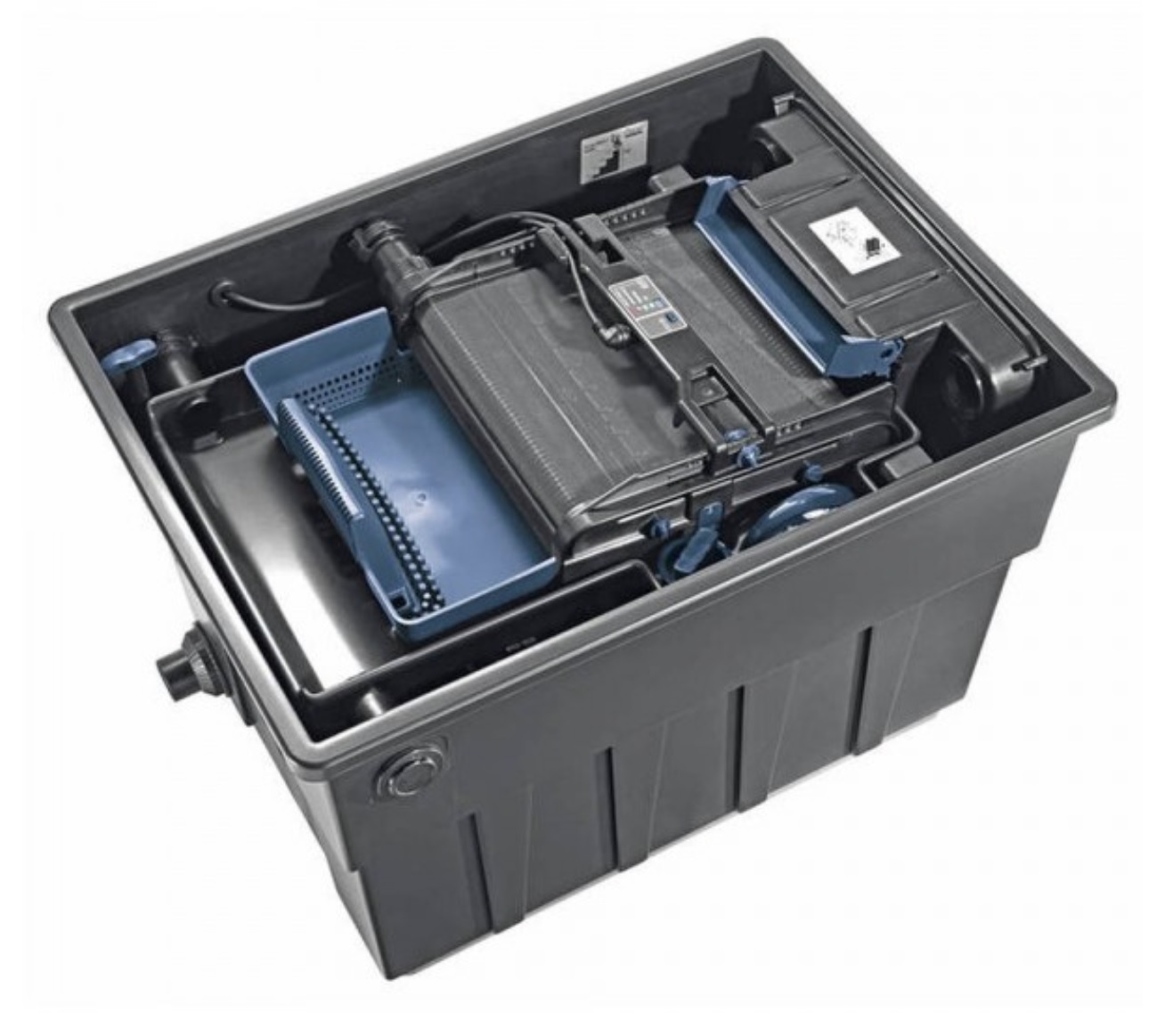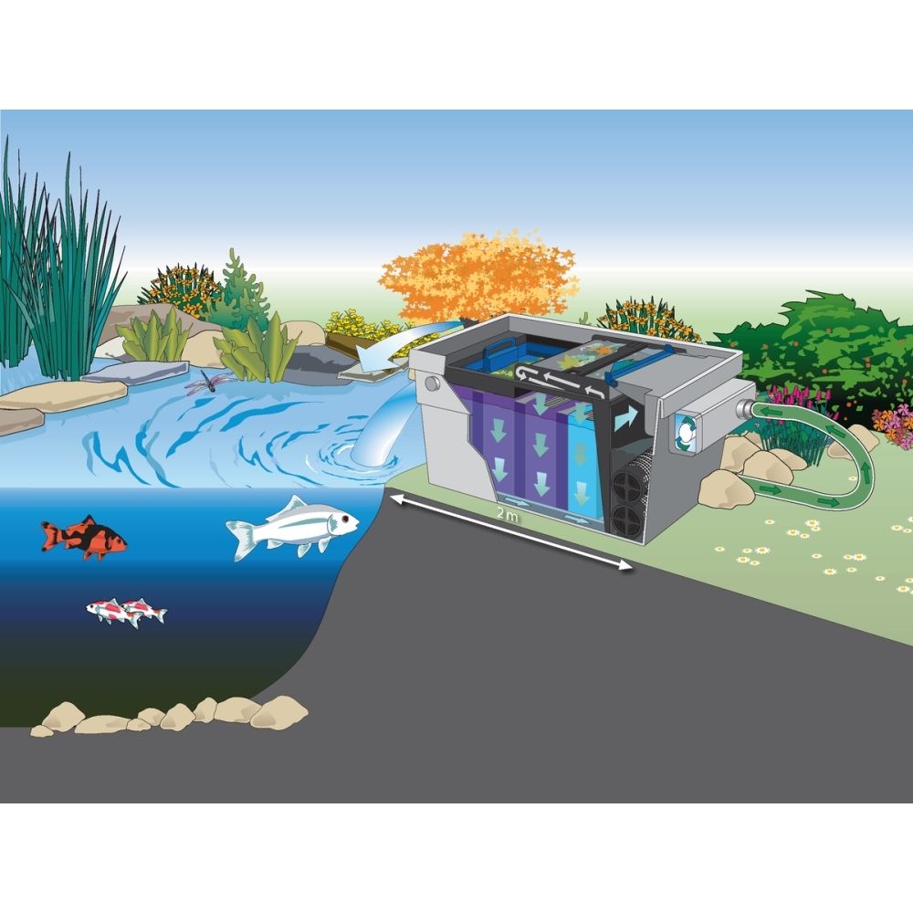 Über die angeschlossene Teichpumpe wird das Wasser durch ein grobes Edelstahl-Sieb geleitet, das sich automatisch selbst reinigt. Feinfiltermedien und spezielle Filtermatten übernehmen im Anschluss die biologische Reinigung. Dadurch werden Schmutz, Algen und Schadstoffe effektiv entfernt, während die Wartungsintervalle auf ein Minimum reduziert werden.